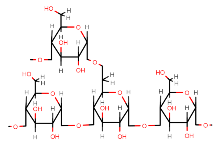 It is highly branched, what type of glycosidic bond form the base of the branches?