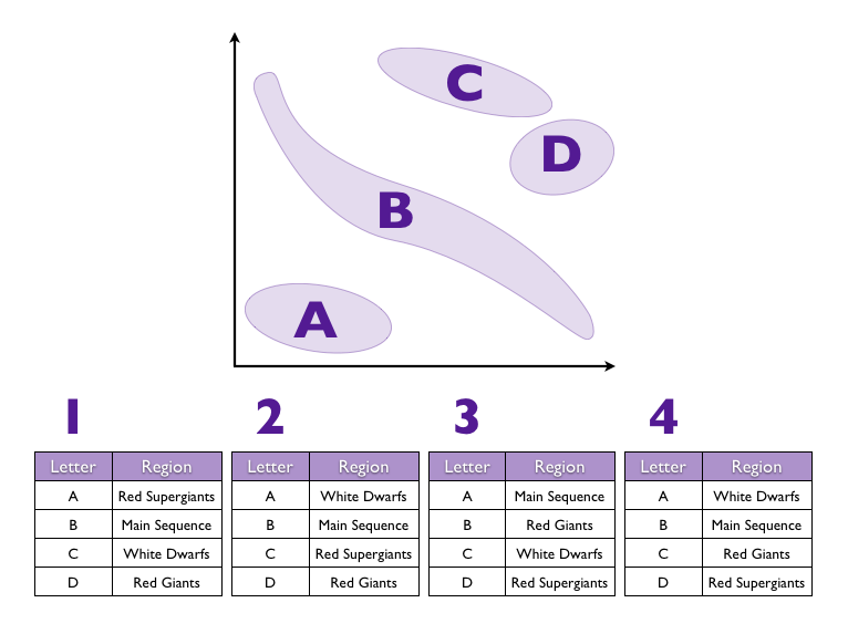 A Hertzsprung-Russell diagram is shown above, select the correct combination of labels.