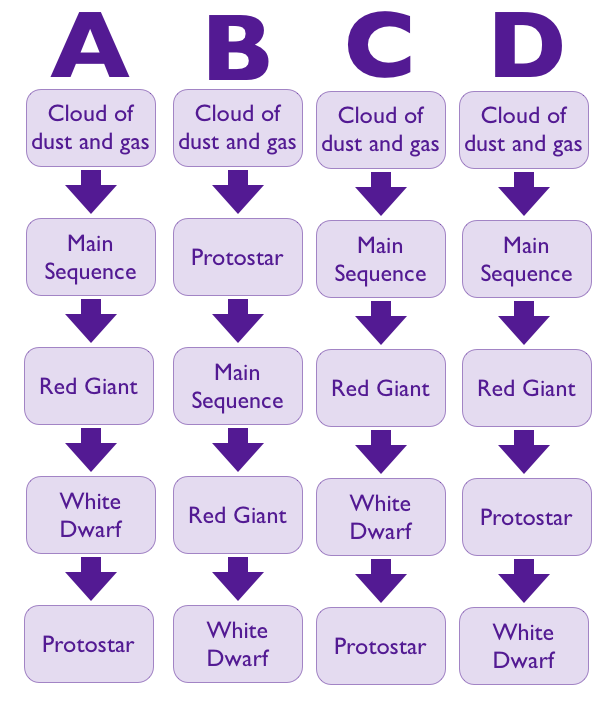 Using the image above, select the correct order for the expected life cycle of our Sun.